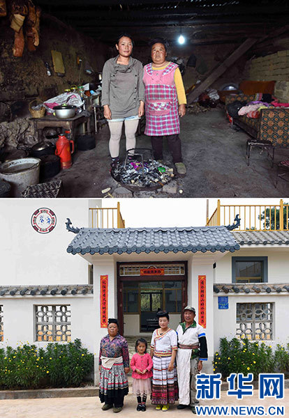 拼版照片:上图为云南省寻甸回族彝族自治县塘子街道山后村苗族妇女张翠兰(右)与女儿在旧屋子里留影(2017年5月31日摄);下图为云南省寻甸回族彝族自治县塘子街道山后村苗族妇女张翠兰(左一)与女儿、丈夫、孙女在新居前留影(2017年10月10日摄)。新华社记者 杨宗友 摄