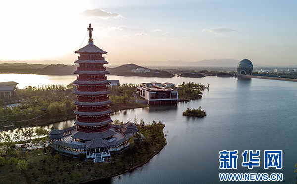 北京怀柔雁栖湖雁栖塔(2017年5月6日摄)。“一带一路”国际合作高峰论坛于2017年5月14日至15日在北京举行,怀柔雁栖湖国际会议中心是此次高峰论坛的主会场。新华社记者 李鑫 摄
