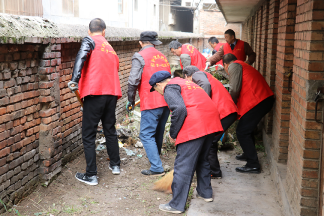 (红色党员先锋队认真清理小巷道的死角垃圾)