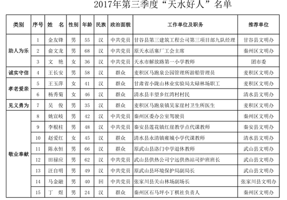 天天天水网讯【记者罗双红】2017年第三季度“天水好人”名单日前出炉,金友锋、文 艳等15人榜上有名。