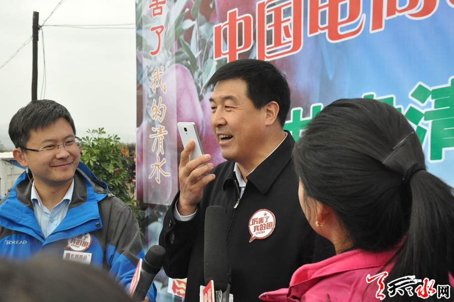 天水市人大常委会副主任、清水县委书记刘天波在接受甘肃电视台现场采访时说:“这些年来,我们清水县在脱贫攻坚上也做了大量的工作,农村水电路房的问题已经基本解决,但是群众要脱贫最重要的是要让群众腰包鼓起来,让群众过上好日子。基于这样的认识,我们把发展产业作为主攻方向,提出了到2020年建设60万亩干鲜果的奋斗目标,我们算了一账,如果人均实现2亩园,收入就能过万元。至目前,在全县上下的共同努力下,已经建成果园55.6万亩。像我们今天看到的远门镇夜明村,基本上家家户户都有了苹果园,这是我们感到非常欣慰的。从这两年的工作来看,电商扶贫还是取得了一定的成绩,在党委、政府的大力引导下,我们动员全县3千名干部参与电商扶贫行动,数万名群众的积极性调动了起来,形成了“干部学生全动员、男女老少齐上阵,儿女在外接订单、父母在家发苹果”的良好局面。近几年通过电商销售,我们清水的特色农产品走出了山沟沟,通向了大市场,卖出了好价钱。下一步,我们将认真学习贯彻党的十九大精神,大力实施乡村振兴战略,举全县之力抓好脱贫攻坚一号工程,全力推进特色产业建设, 进一步完善电商服务体系,积极 创新电商扶贫模式,让贫困群众学电商、用电商,借助电商平台实现脱贫,确保我县到2020年高质量摘到贫困县的帽子。”