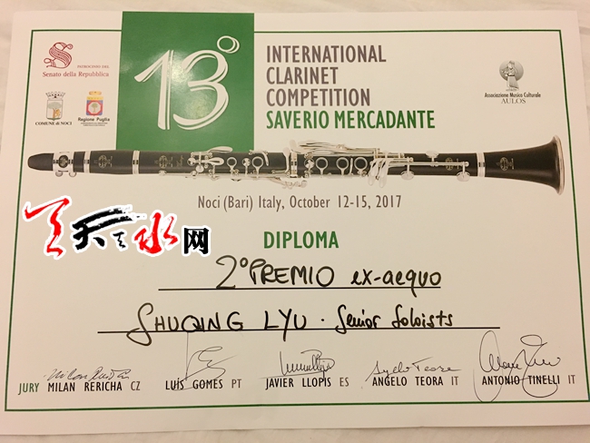 据介绍,此次前往意大利参加“Saverio Mercadante”国际单簧管比赛的共有来自17个国家的44名选手,历经三轮激烈的角逐后,共有6人进入决赛。最终,年仅24岁的吕树清取得了第二名的好成绩。