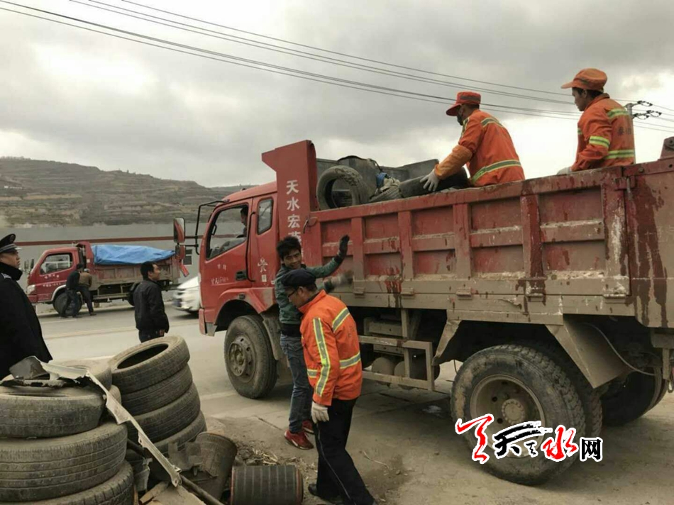11月9日至10日,由秦州区副区长罗增芳统一指挥,区执法局等9部门和玉泉镇、天水郡街道多部门联动,集中对国道316线长仪路至贾家寺路段城市南出入口道路两侧乱搭乱建、乱堆乱放、乱摆乱设、乱停乱靠等“八乱”现象进行了治理。强制拆除乱搭建的板房、棚舍40余处,清理清运堆放于道路两侧的废弃轮胎,砖瓦石块80余车40余吨,拖离“僵尸车”12辆,有效保证了区域沿线环境干净整洁。
