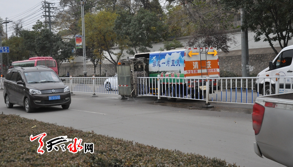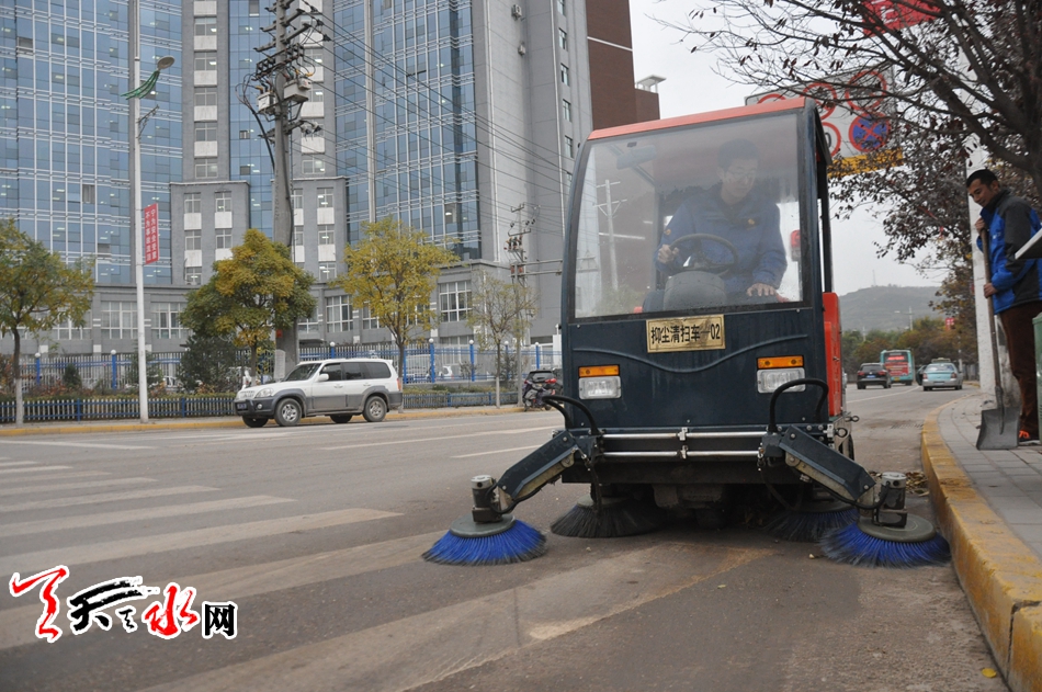 为了确保城区道路干净整洁、无扬尘,秦州环卫部门加强精细化、机械化湿法作业方式,“全方位,高标准”开展道路扬尘防治工作。大力购置环卫机械,不断提高环卫机械化程度,实现从单纯的清扫保洁向精细化、机械化“清洗+除尘+抑尘+保洁”的转变,动用大型清洗车、洒水车5辆,喷雾抑尘车2辆,护栏清洗车1辆,小型清洗车10辆,小型人行道清洗车4辆,采取地毯式吸尘、人机结合清洗、机械化清扫、精细化保洁、调度洒水、高空抑尘“六位一体”作业措施,对羲皇大道等城市主次干道、人行道、广场、步行街开展地毯式清洗,全面清除道路积尘、道路扬尘。目前,建成区机扫率已达到85%以上。进一步延长洒水作业时间,从每天早6:00至第二天凌晨1:00,全天18个小时“加班加点”开展洒水降尘,重点对羲皇大道、成纪大道等重点路段实施“循环不间断”洒水、“错时段”机械化清扫、“全时段”保洁保湿。同时,严格要求清扫保洁人员,采取“先洒后扫”的湿法作业方式,为清扫作业人员配备洒水壶,严格控制作业扬尘污染。