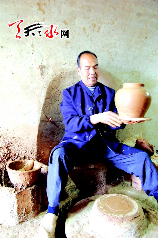 在康旺才位于青龙山的土窑里记者看到,靠近土窑门口有一个制陶的操作台,用来拉坯的转轮被安置在一个土坑内。康旺才告诉记者,这个转轮是用木头和泥土制作而成,是传统制作陶器的必备物件。边说着话,康旺才开始动手给记者演示起来。他先是将一根捏好的泥条熟练地放在转轮上,随着转轮旋转,泥坯在康旺才的手中不停变化。康旺才轻轻扶住泥坯,一只手不时用羊毛毡和薄木片蘸上泥水在泥坯上涂抹着,在他的手脚并用下,约莫十分钟左右,泥坯便渐渐出落成一个凹凸有致的泥罐。