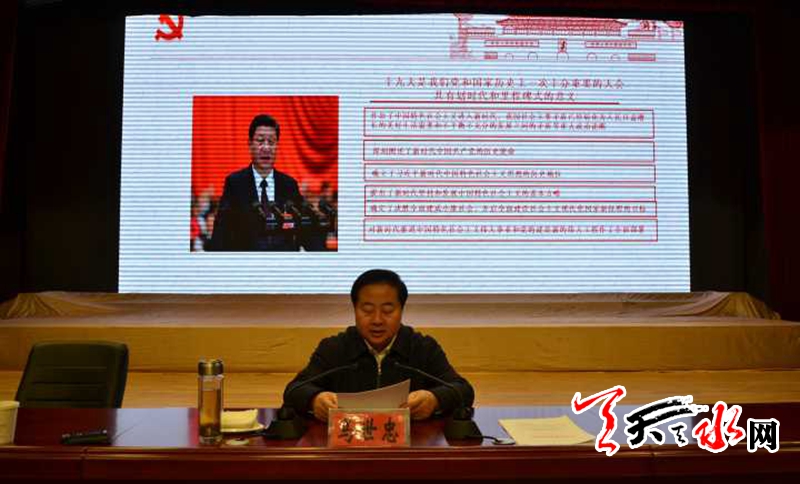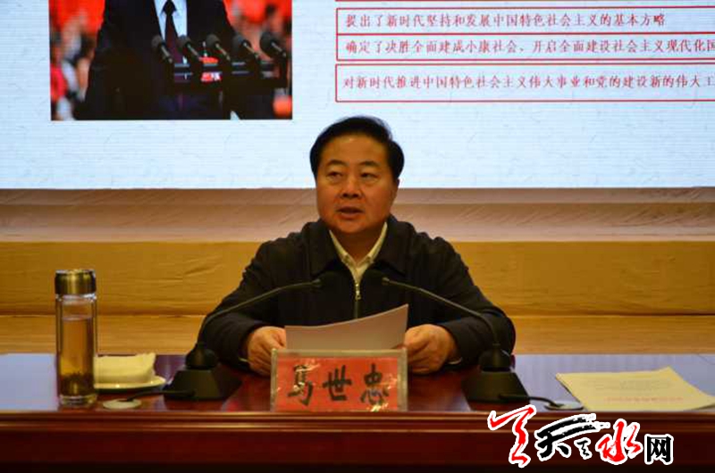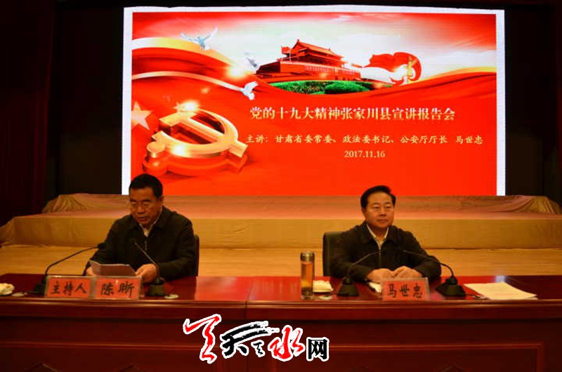 天天天水网讯【全媒体记者吴丽娜】11月16日,省委常委、省委政法委书记、省公安厅厅长马世忠来到张家川回族自治县宣讲党的十九大精神。他强调,要把学习宣传贯彻党的十九大精神作为当前和今后一个时期的首要政治任务,在学懂弄通做实上狠下功夫,真正把思想和行动统一到党的十九大精神上来,以良好的精神状态、扎实的工作作风,确保党的十九大确定的各项目标任务落实落地。