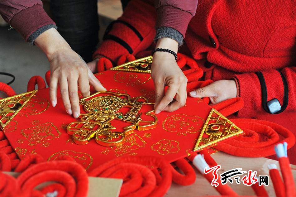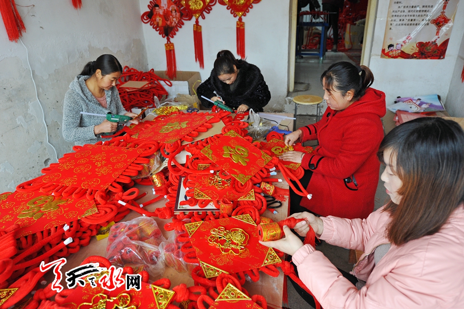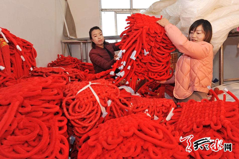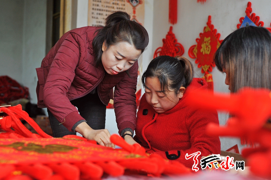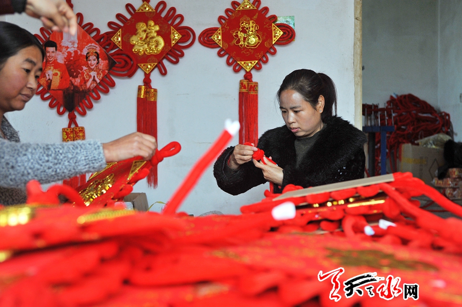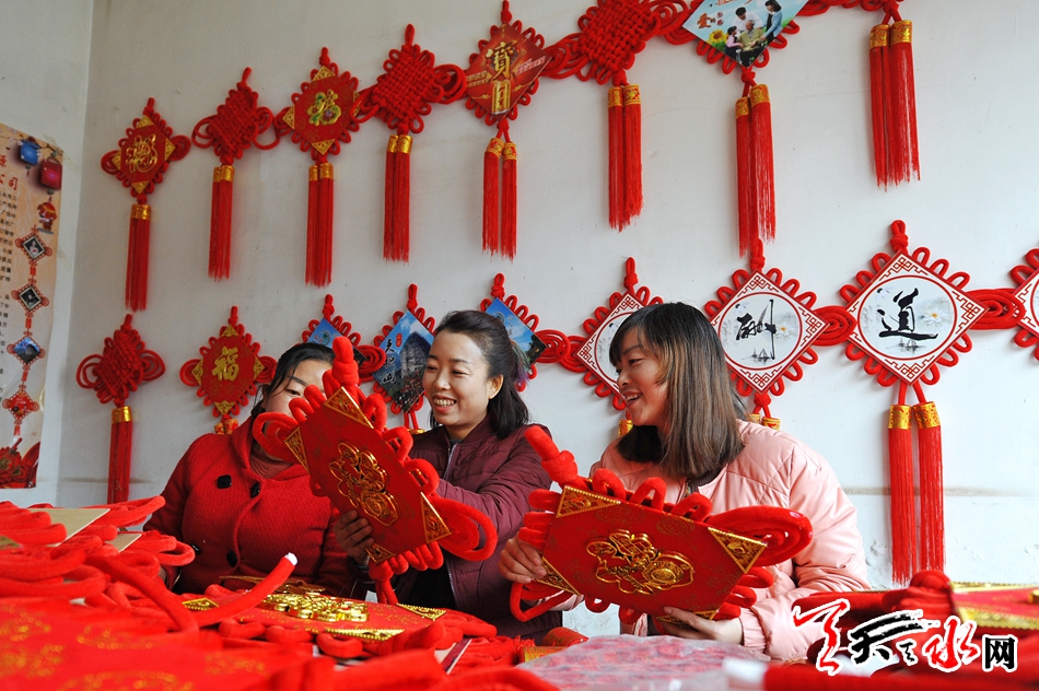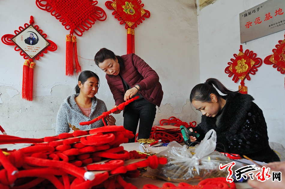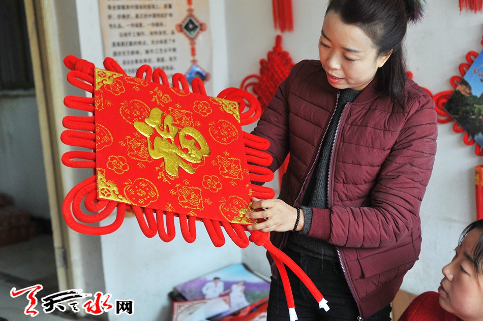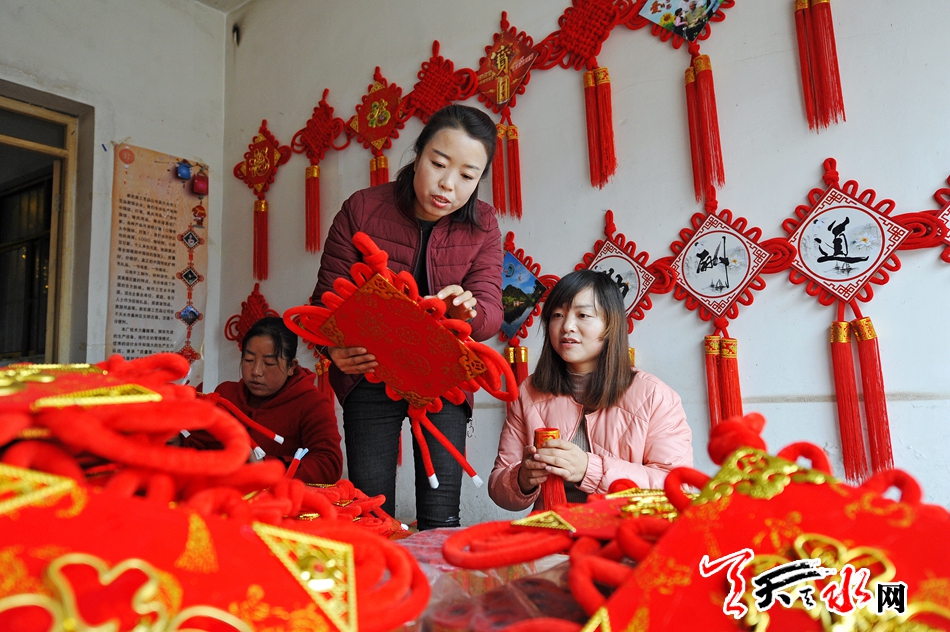 11月16日,秦州区藉口镇不逢集,街上人也不多。临街的一间铺子里却很热闹,也很喜庆。五六位年轻妇女围坐在一起,正在编织中国结。挂满红色中国结的墙上,一块牌子写着“‘陇原巧手’示范基地”。