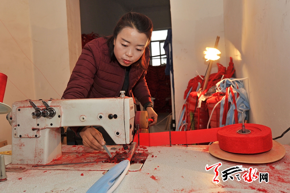 (史瑞荣操作缝纫机进行编织中国结的第一道工序:打线。)