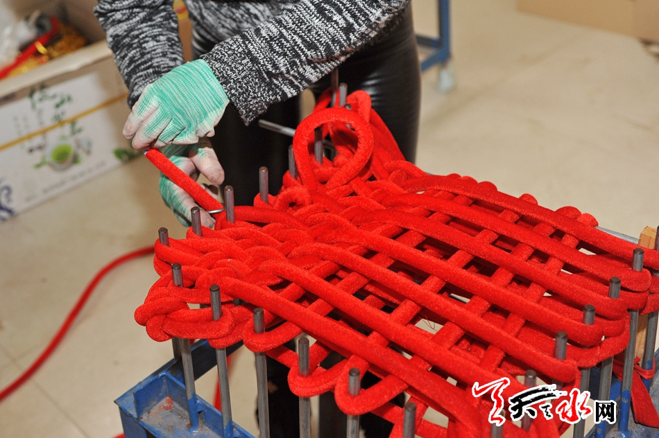 在钢架上手工编织中国结。
