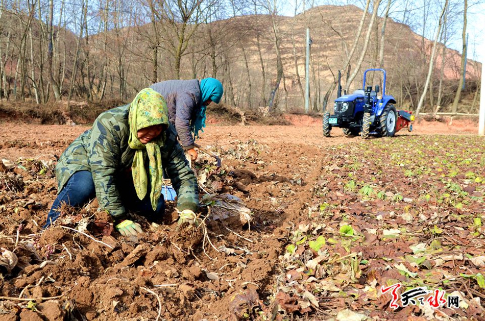 11月21日,地处陇西、通渭、武山、甘谷交界处的堡东村迎来了冬花采收的黄金时期,荒芜苍凉的原野上,来自十里八乡的村民抢抓时机,采挖冬花的场景构成了一幅丰收喜人的交响乐章。一墩墩出土的冬花堆放在田垄上,一簇簇粉嫩的花蕾在冬日里显得明丽透亮。女人们一双双灵巧的手上下翻飞,一粒粒粉色的花蕾划着优美的孤线飞落在脚下的竹篮里,绽放着“冬之花”的丰硕。