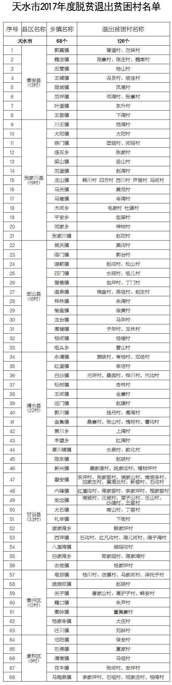 根据《甘肃省贫困退出验收办法》,天水市2017年度拟退出贫困村,经乡村自评,退出验收指标涉及的市县行业部门验收,市脱贫攻坚领导小组组织验收工作组逐村核实认定,乡村、县区、市有关责任人签字认可、认定,共有126个贫困村符合退出标准,现按照贫困退出验收办法规定,向社会公告,接受社会各界监督。