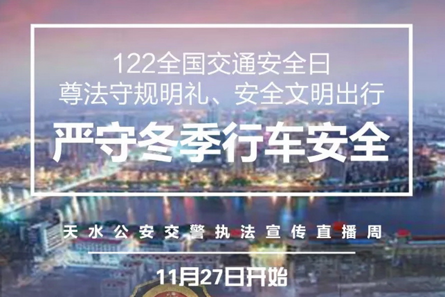天天天水网讯 今年12月2日是第6个“全国交通安全日”,为创新宣传形式、丰富宣传内容、提升宣传效果,自11月27日起至12月2日,天水市公安局交警支队组织全市公安交警部门开展了以“尊法守规明礼、安全文明出行”为主题的执法宣传直播周活动,为今年冬季交通事故预防及明年春运交通安全工作营造了良好的宣传氛围。