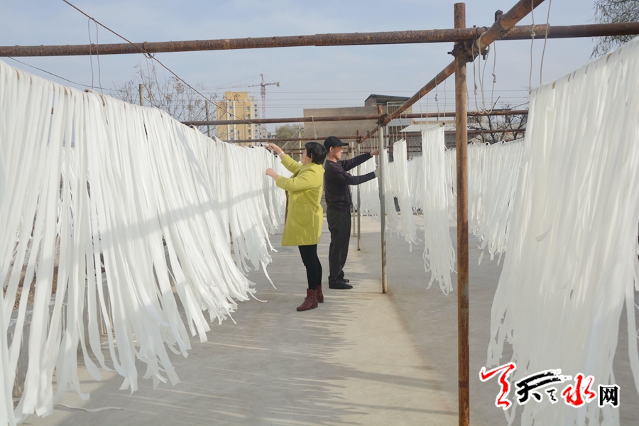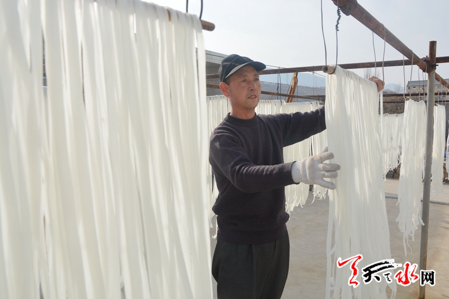 如今,谢小军在武山县山丹乡贾河村租了厂房,雇了15个工人在生产粉条。当记者一行中午时分到达他的厂里时,上午生产出来的数百斤粉条正在阳光底下晾晒,工人正有序地将成品装箱打包。