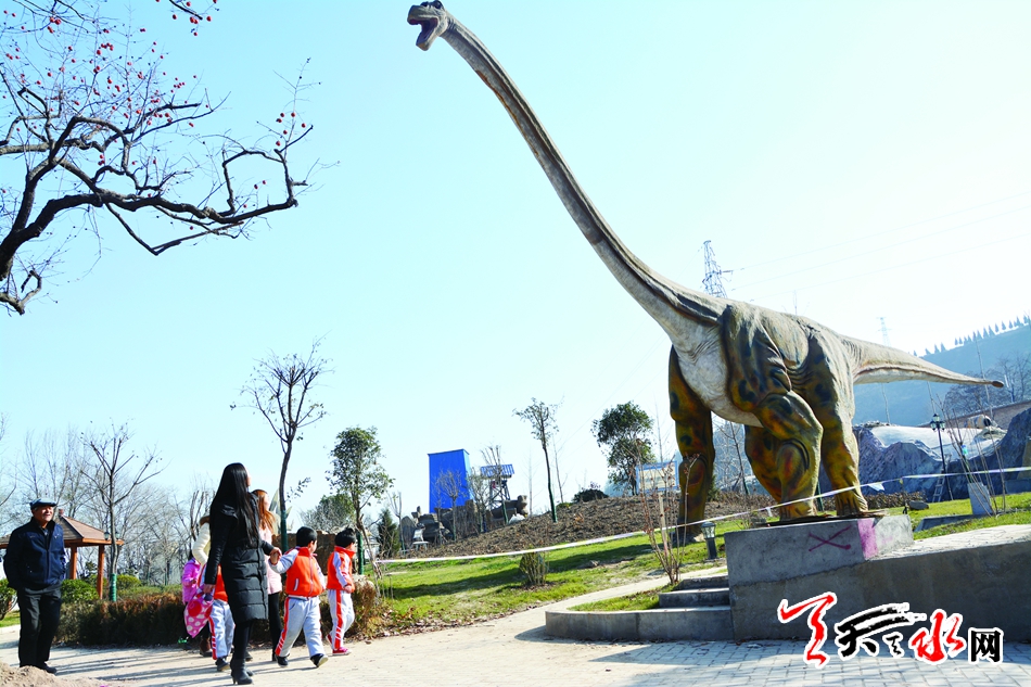 12月9日上午,一些市民领着孩子在甘肃工业职业技术学院地质园参观游玩,该地质园内各种栩栩如生的恐龙模型吸引了大家的目光。
