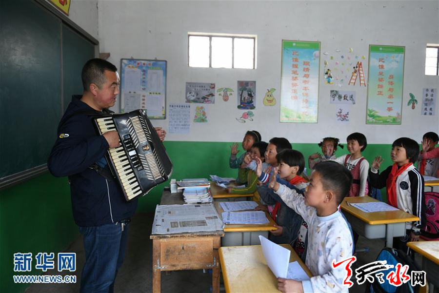 走教老师王峰峰在甘肃省秦安县陇城镇上袁村上袁教学点给孩子上音乐课。