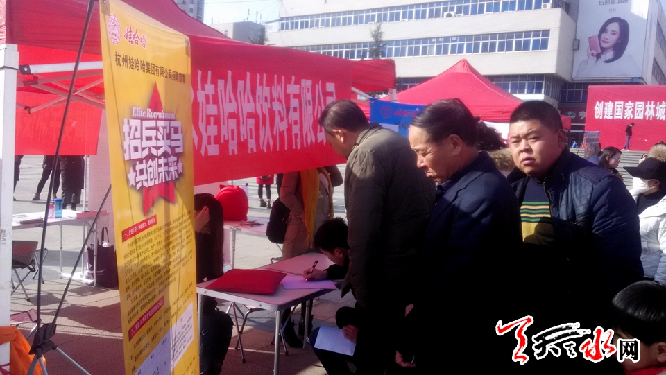 当日,参加本次招聘会企业有市属各类型企业如:天水程达电气有限公、天水九创装饰工程有限公司、天水市天祥水泥(集团)有限公司、天水华天合汽车销售服务有限公司、天水众兴菌业科技有限公司、天水苏宁云商销售有限公司、天水华天科技股份有限公司、天水娃哈哈饮料有限公司等。现场参加应聘的人员有1000多人次,有意向签订的100多人次,在解决企业用工难的同时。为双方搭建了良好的人才交流沟通平台,有效促进了全市下岗职工和农民工、农村劳动力转移人员、青年就业和高校毕业生及社会其它各类人群就业。