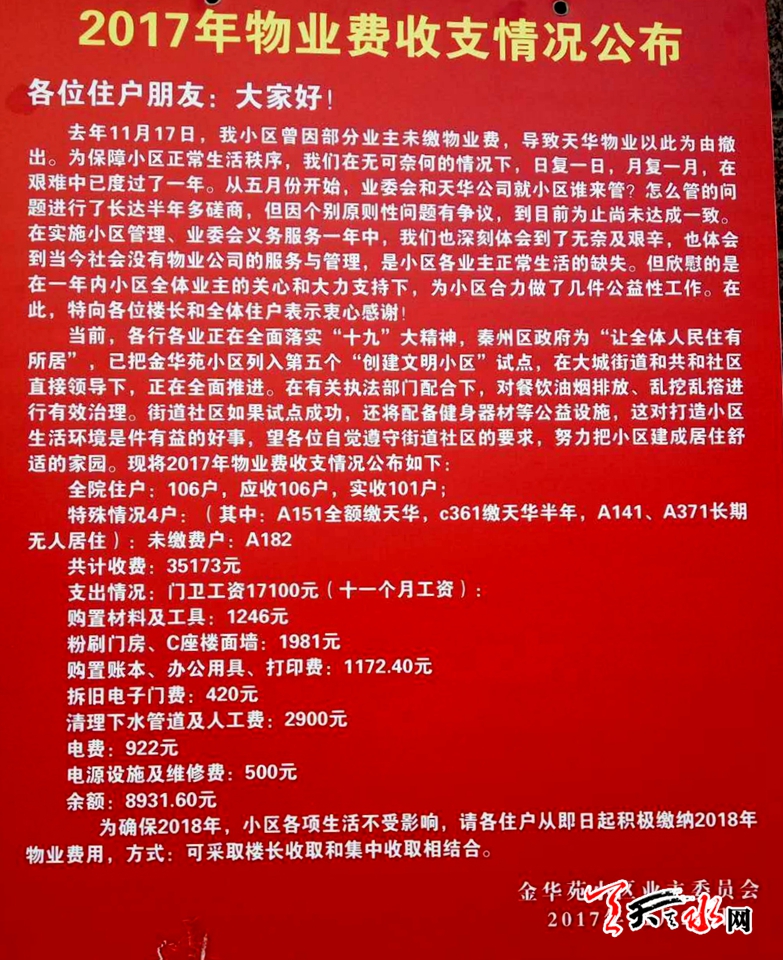 去年11月17日,金华苑小区曾因部分业主未缴纳物业费,导致天华物业撤离,让该小区进入了“三无小区”的行列,虽然该小区业委会和天华公司就小区管理问题进行了多次磋商,但因个别问题存有争议,至目前磋商未果,今年,秦州区政府把金华苑小区列入为第五个“创建文明小区”试点,6月,该小区在共和巷社区和区物管办的协助下,成立了金华苑小区业主委员会,同时试点工作正在全面推进,目前,在有关职能部门的大力配合下,对餐饮油烟排放、乱挖乱搭进行了有效治理,小区面貌也有了较大改观。