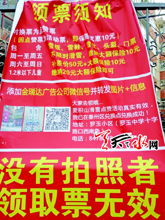 严寒中排队两次没领到票市民汪女士说,12月6日,她在微信朋友圈里看到一条消息“麦积山滑雪场集结号已吹响”,被网友们转发得非常多,消息内容大致是说,只要转发此消息并集赞38个,就可免费领取滑雪场门票1张,集赞68个就可免费领取门票2张,领票时间截止到12月17日。因为平时滑雪场的门票一张要一百多元,而现在仅需集赞就可领到票,寒假期间可以带着孩子去玩滑雪,于是她也马上转发这条消息,次日就集够了68个赞。