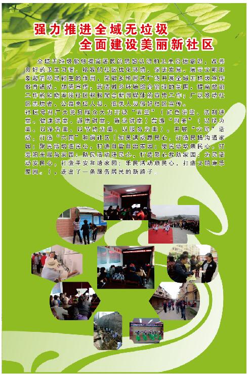 社区号召广大党员群众大力开设“五堂”( 红色讲堂、法制讲堂、健康讲堂、道德讲堂、就业讲堂)营造“四美”( 以绿为美、以净为美、以节约为美、以服务为美),开展“六民”活动,打造“六园”和谐社区(知民活动赢民心,打造民情沟通家园;聚民活动连民心,打造自管自治家园;便民活动亲民心,打造阳光服务家园;助民活动暖民心,打造爱心救助家园;为民活动安民心,打造平安和谐家园;乐民活动顺民心,打造文明康乐家园。),走出了一条服务居民的新路子。