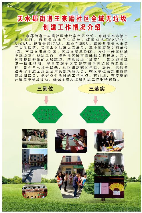 为此。王家磨社区采取多种形式广泛开展全域无垃圾宣传教育活动,加强宣传,营造城乡环境综合治理的氛围,充分利用社区宣传栏开辟社区环境整治活动园地,提倡文明新风,引导居民养成良好的卫生习惯,树立公共卫生意识;在整个环境卫生整治活动过程中,积极宣传涌现出来的先进个人,充分发挥榜样和先进的示范带头作用,营造社区全域无垃圾创建工作的良好氛围,保证此项活动深入开展。自开展全区无垃圾创建及河长制工作以来,开展大型宣传活动5次、参与人数2500人次,发放宣传单发放宣传单2600余份。发放全域无垃圾倡议书680余份社区充分利用辖区单位的电子显示屏,网络、媒体、微信、居民QQ交流群等方式,大力宣传环境卫生综合整治工作,形成全民知晓、全民支持、全民重视、全民参与的工作局面。动员广大居民、党员从自己做起,从自己生活小区开始,主动捡拾垃圾、清洁环境,形成了居民全员参与的良好工作格局。