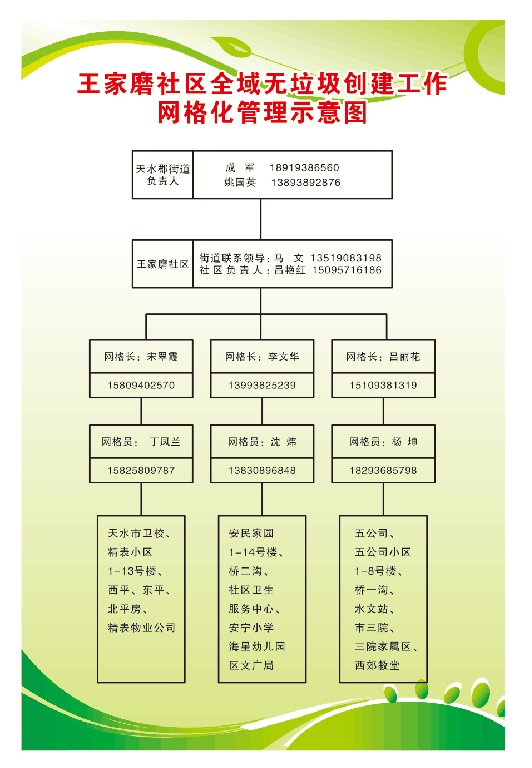 为确保全社区全域无垃圾工作做到长效化、制度化,通过建立环境卫生集中整治、划区域包干责任制度、成立了社区“二级河长”制、制定了王家磨社区河长制工作方案,成立由社区主要领导任组长、其余社区副职领导任副组长、各相关单位领导为成员的王家磨社区全面落实河长制协调推进领导小组,牵头组织对侵占河道、超标排污、倾倒垃圾等突出问题依法进行清理整治,协调解决河长制实施过程中的重点难点问题。