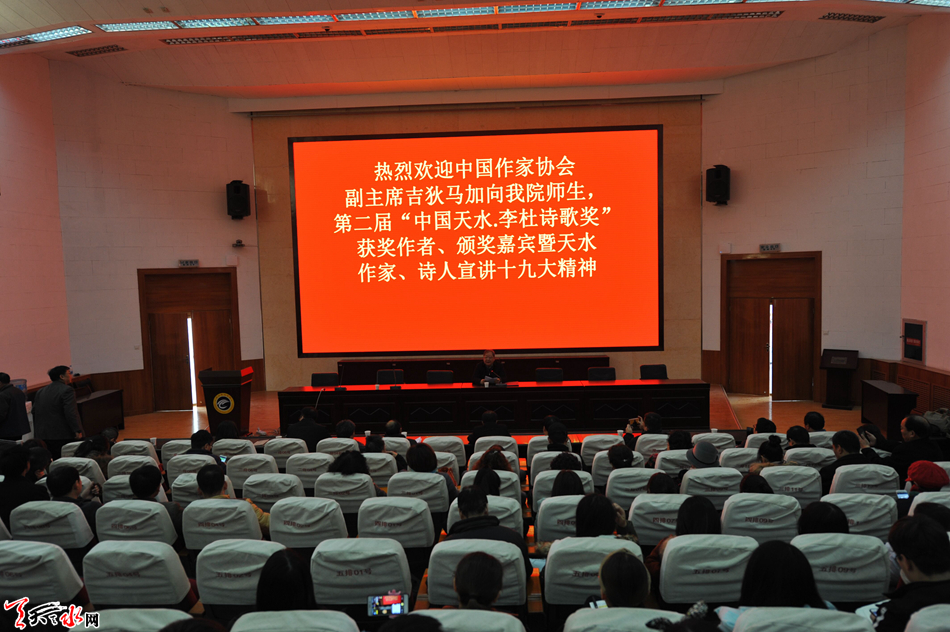 天天天水网讯【全媒体记者王晓馨】12月30日下午,中国作家协会党组成员、书记处书记、副主席吉狄马加,在天水师范学院向前来参加第二届“中国天水·李杜诗歌奖”颁奖活动的获奖作者、颁奖嘉宾、天水市文学界人士及天水师范学院文传学院师生宣讲党的十九大精神。