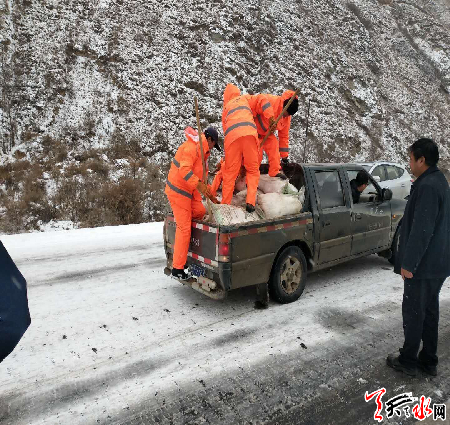 天天天水网讯 2018年1月2日至3日天水市普降大雪,对我市道路交通带来较大影响,由于甘麦公路承担着分流天定高速公路的重任,为保障过往车辆安全。市公路管理局紧急启动应急预案,路政及养护人员上路开展撒盐作业,对弯道、桥梁、明弯等积雪不易融化路段撒盐除雪,并加强道路管理,指挥车辆缓慢有序通行。目前甘麦公路积雪严重路段已完成撒盐作业,下一步,市公路管理局将根据天气变化,进一步强化管理,跟进作业,确保甘麦公路安全畅通。