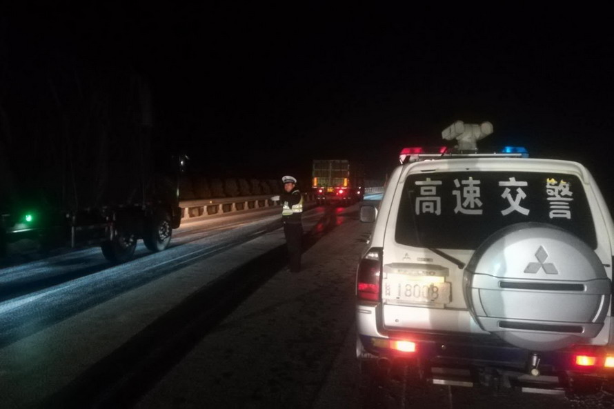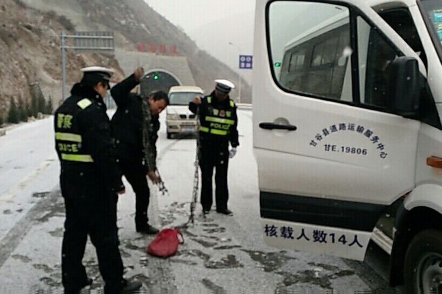 甘泉高速大队接到省路警联合指挥中心指令后,对全线路段进行临时交通管制,同时联系高速公路养护部门加快撒盐除冰工作;大队领导带头上路,全员到岗不间断开展路面巡逻工作,对李子坪、白杨岭、东岔河特大桥上滞留的车辆进行疏导,逐车帮助驾驶员安装防滑链,确保其安全通行。