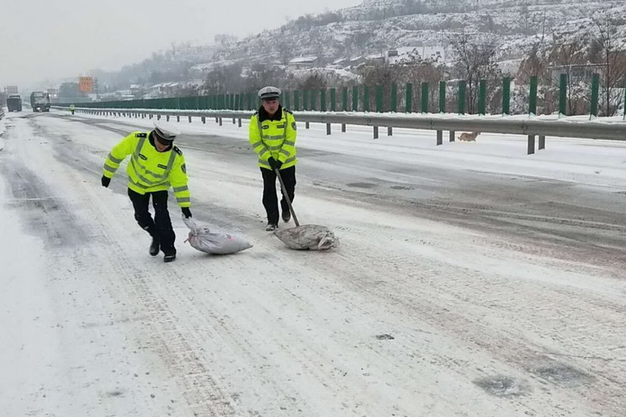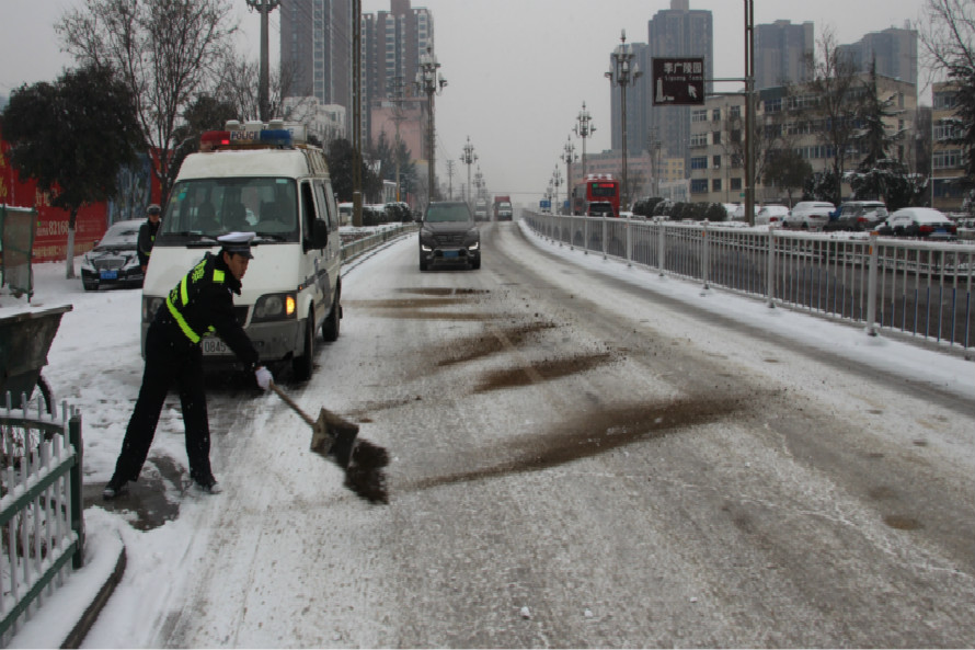 机动大队领导分别带队,在石马坪、迎宾桥、七里墩、地校等路段进行巡逻管控,清理路面占道停放、违法停放车辆,协助打滑、抛锚车辆驶离行车道;采取延时下班巡逻、网络媒体和919天水交广台播报路面情况等方式,提醒、劝导过往车辆安全通行;联合路政养护等相关部门,采取撒盐、撒土的方式清理路面积雪。