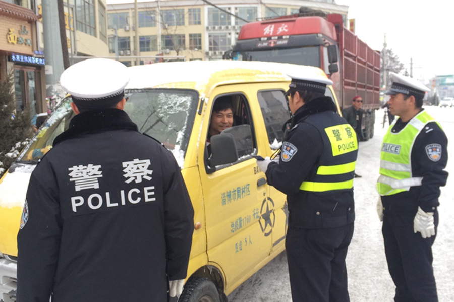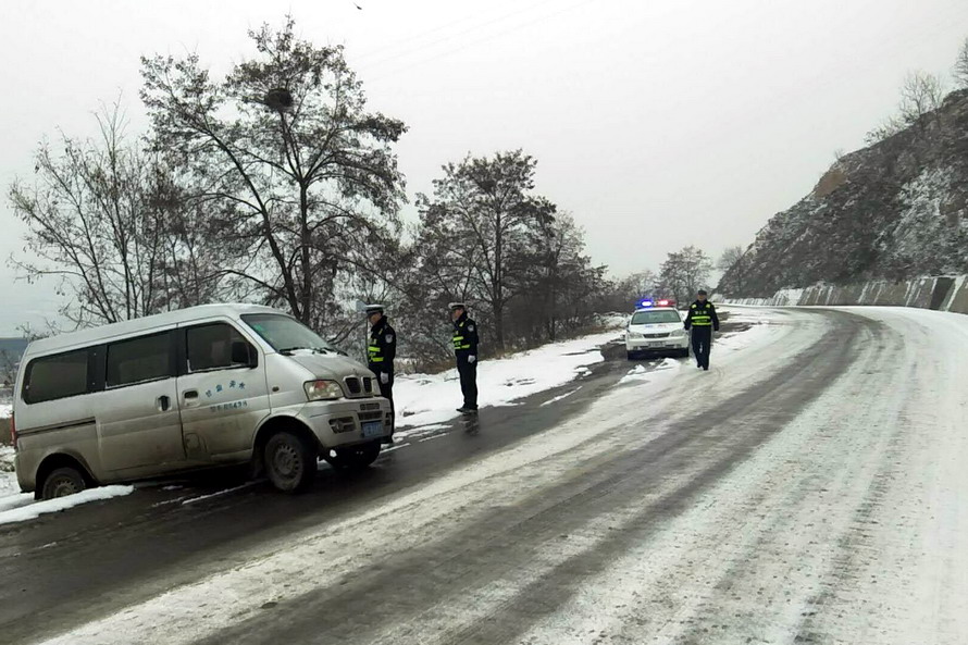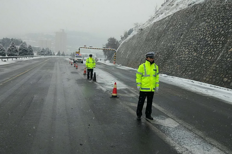 张家川县公安局交警大队在城区各主干道、农村路段增加警力部署,积极疏导交通;对广大驾驶员及路边行人以温馨的提示告知他们雪天安全出行注意事项。