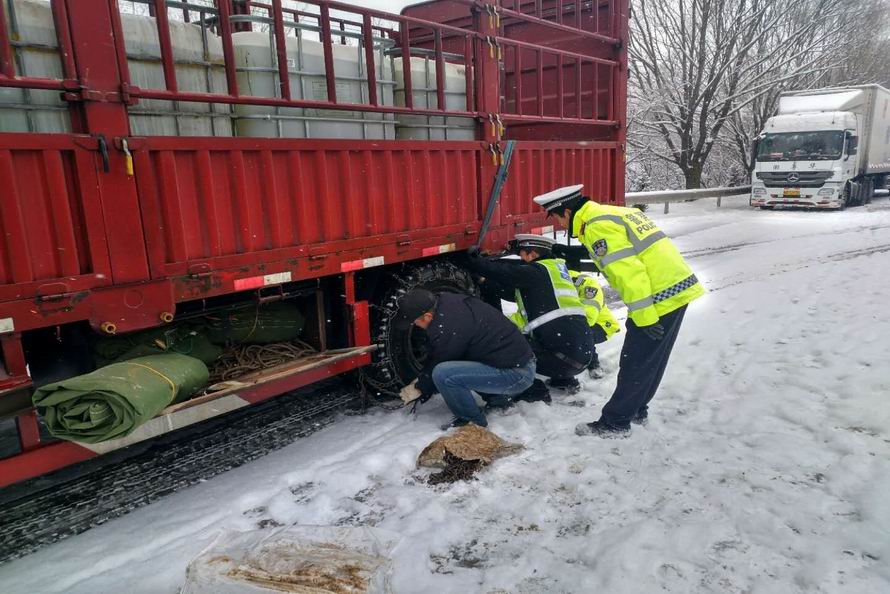 秦安县公安局交警大队各中队民警根据道路状况,加大对辖区路面的巡逻力度,并对过往车辆一一安装防滑链,提示驾驶员冰雪天气下注意减速慢行,保持安全车距。