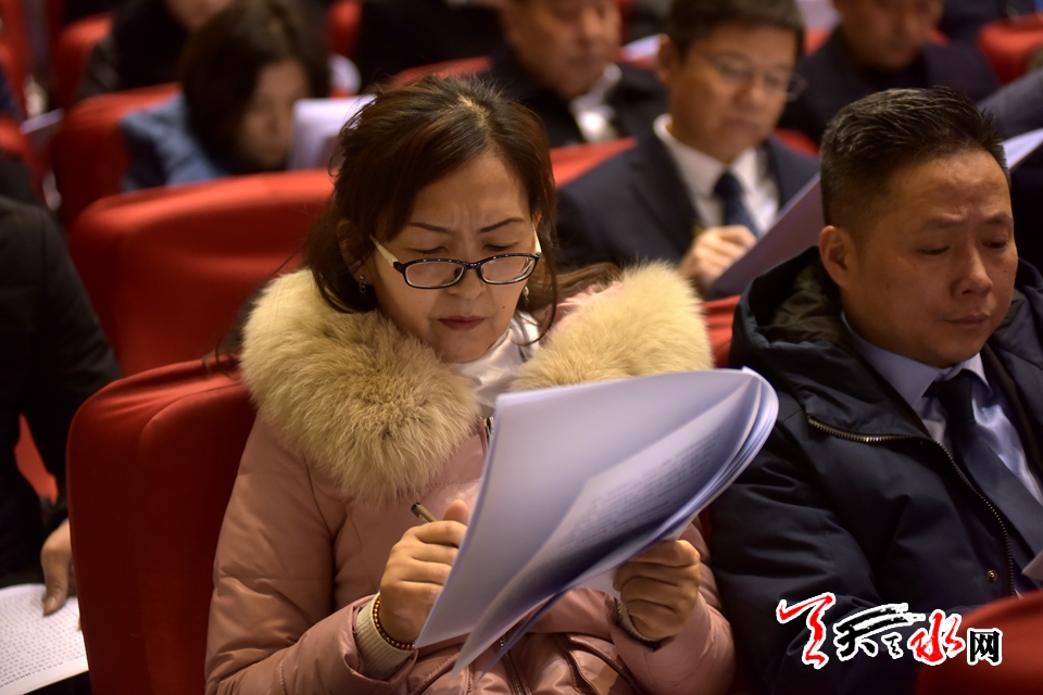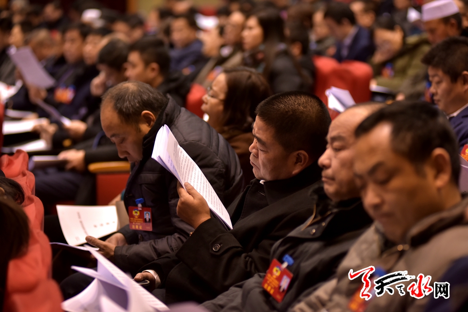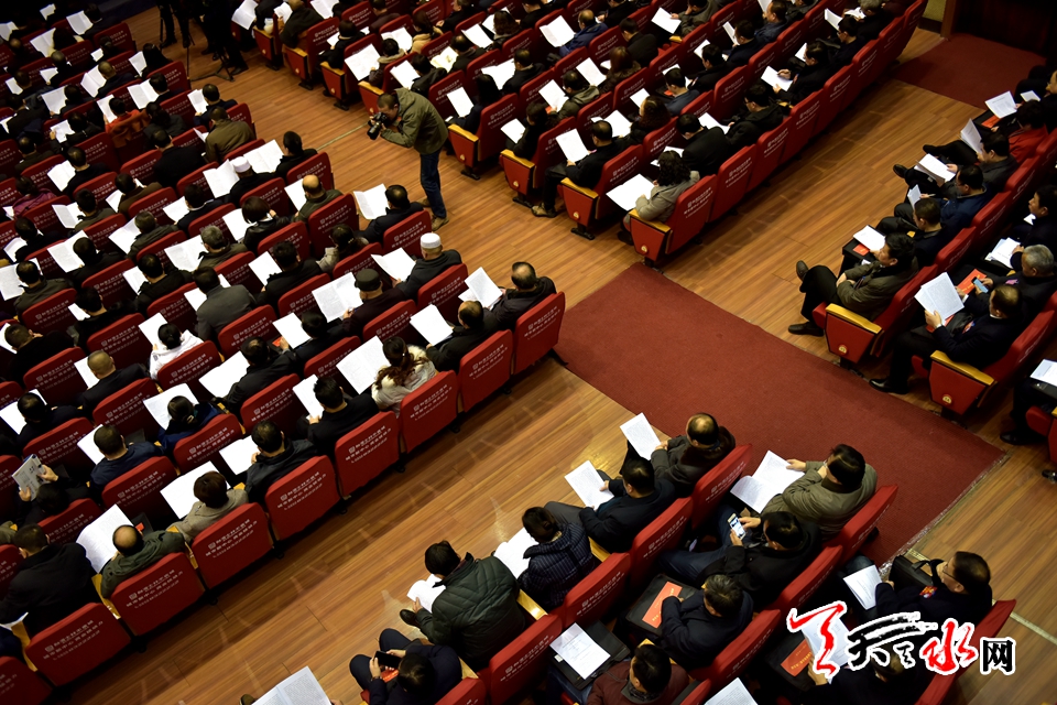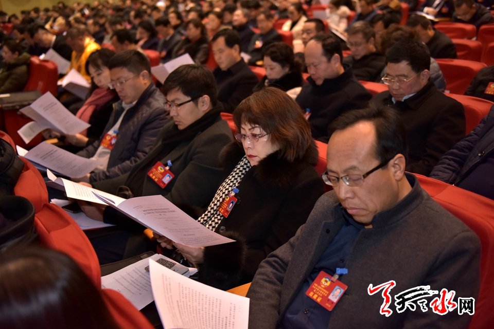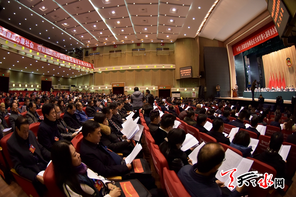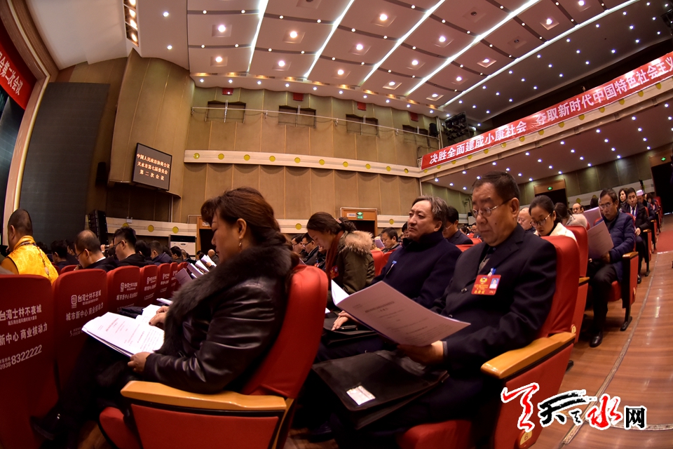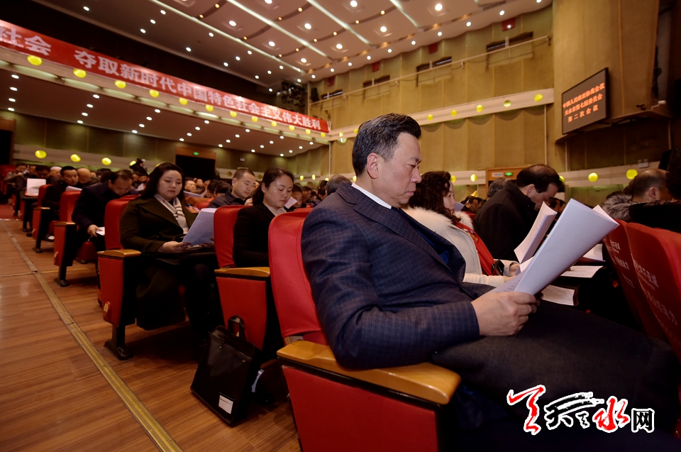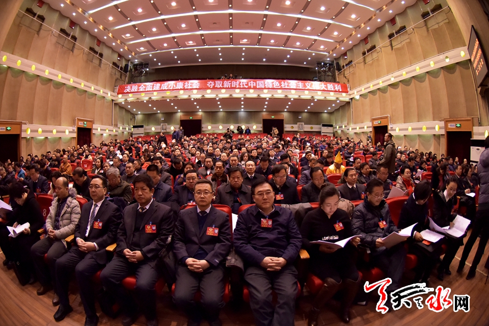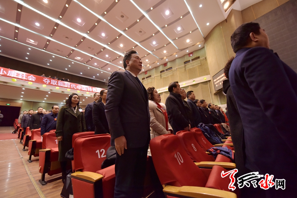 秦州剧院内灯光璀璨,气氛热烈。主席台正中悬挂着的象征全国各族人民大团结的政协会徽,在十面红旗的映衬下熠熠生辉。会场内“决胜全面建成小康社会,夺取新时代中国特色社会主义伟大胜利!”的大红条幅,格外振奋人心。
