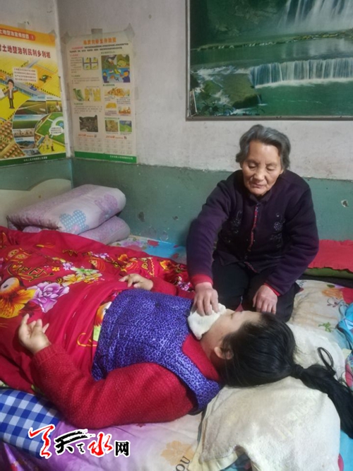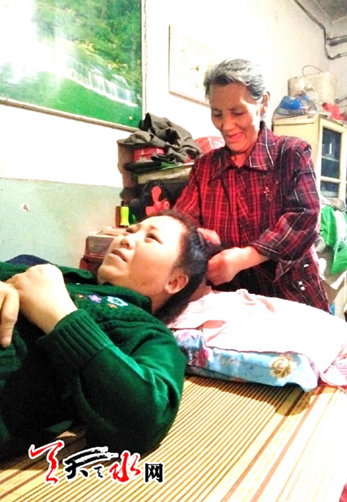 “当时最起码还能下地,生活还能自理,后来由于病情的加重,吴毓琴出现全身僵直感,行动不便,而后便慢慢没有知觉,瘫痪在床,生活完全由婆婆照顾。从此,婆婆吕三娃就更忙了,她必须得每天六点起床,给儿媳煮药,准备早餐,亲手将早餐一勺一勺地喂给儿媳吃。失去自理能力的吴毓琴,曾一度对生活失去了信心,人也变得沉默寡言,为了让吴毓琴能够重新树立生活信心,不自暴自弃。吕三娃每天都让自己乐观地面对吴毓琴,为她梳洗整理,陪她说话。瘫痪在床前期,为避免生褥疮,婆婆吕三娃每隔一个小时就给她翻一次身,做一个小时的全身按摩,通过拉伸四肢,防止儿媳因瘫痪而肌肉萎缩,每天为她擦一次澡。每次做完这些规定动作后,吕三娃早已大汗淋漓,气喘吁吁。吴毓琴病重的时候,全身疼痛都会加剧,苦不堪言,身体一点都不能碰,只要稍稍的擦碰到肌肤就疼得无法忍受,就连张开嘴吃东西都不能。”吴毓琴失声痛哭起来。“说实话,要是没有婆婆的照顾,我早就活不下去了,她就是我的亲妈!”