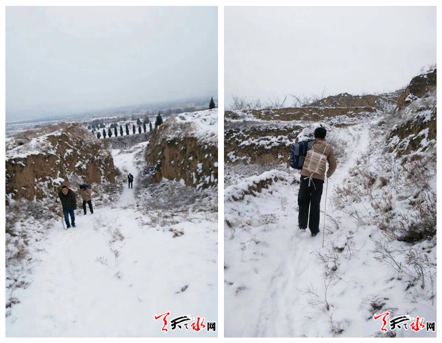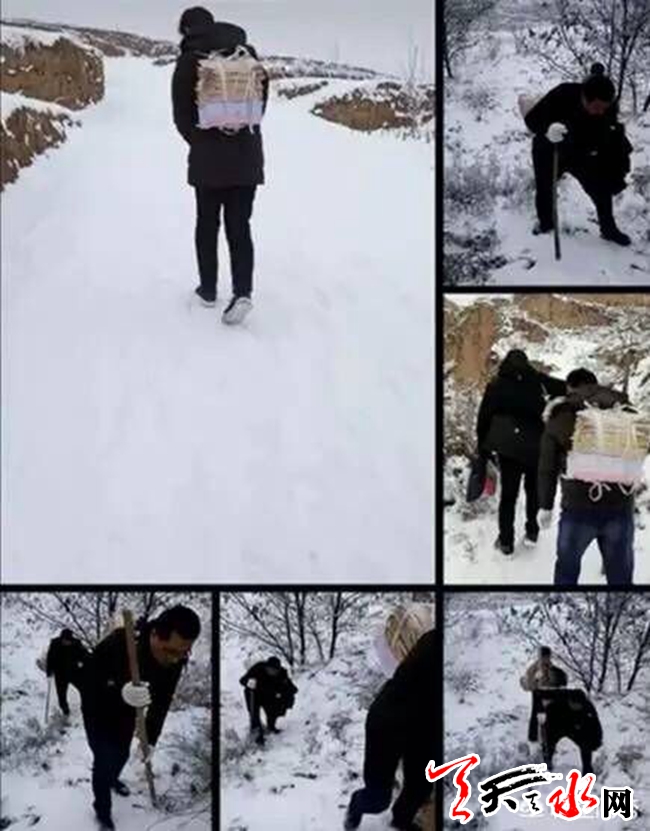 山路陡峭崎岖,雪厚难走,为了防止发生意外,4人将60多公斤重的试卷分开,或背或扛,你扶着我,我牵着你,小心翼翼地向山上的学校艰难爬行。