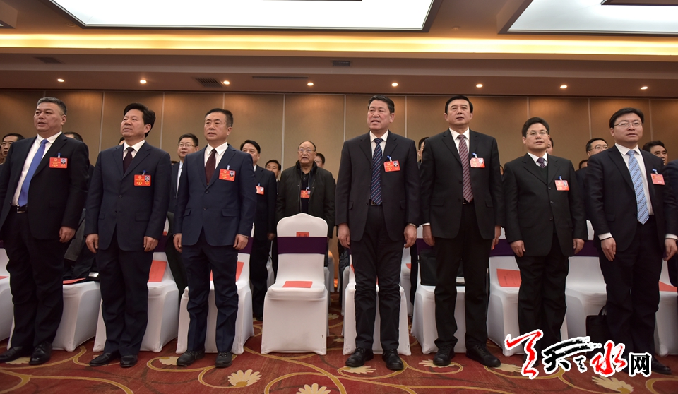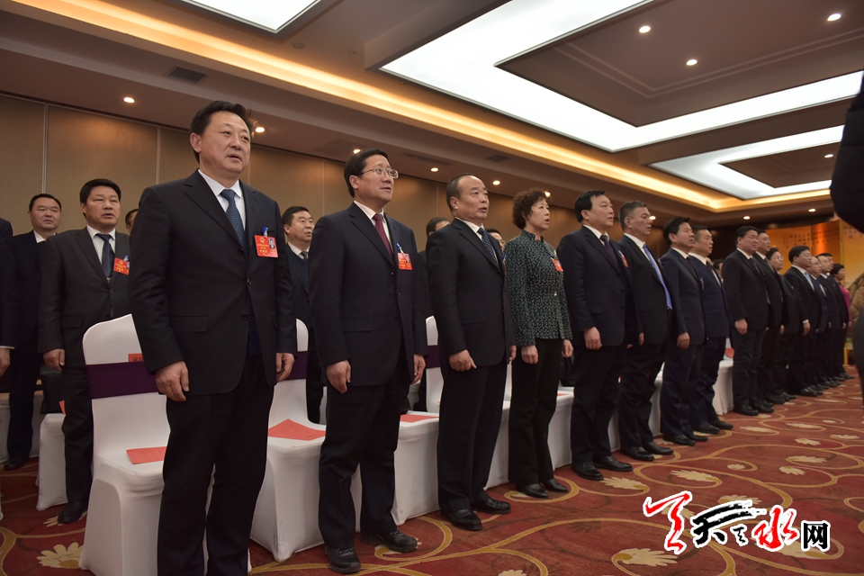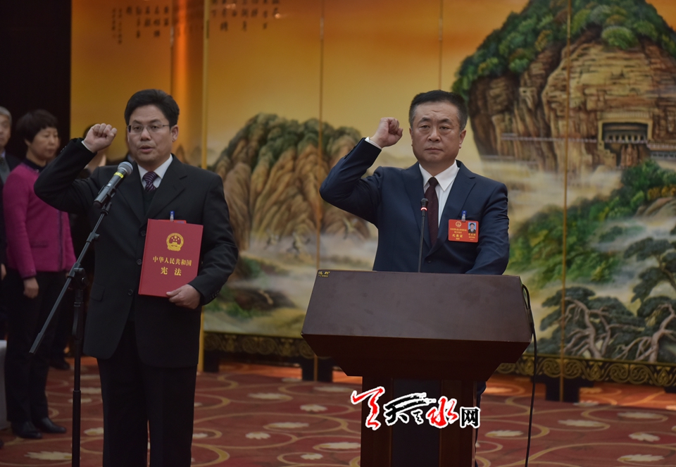 1月9日,天水市第七届人民代表大会第三次会议举行宪法宣誓仪式,市委书记王锐主持宣誓仪式,在市七届人大三次会议上当选的市人大常委会主任蒋晓强和市监察委员会主任王国先向《宪法》进行了郑重宣誓。天天天水网记者何永德 杨旭 摄