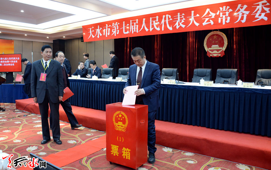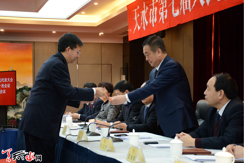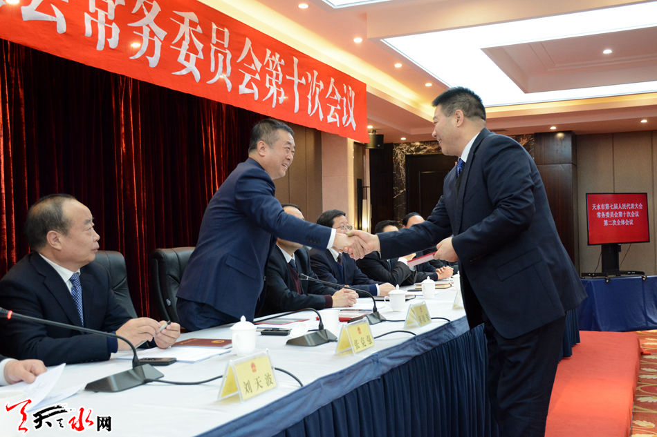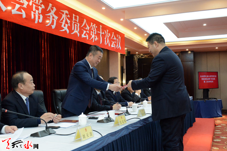 在第二次全体会议上,以电子表决的方式表决通过了天水市第七届人大常委会免职人员名单和关于接受辞呈的决定。以无记名投票的方式,任命了部分市政府组成部门负责人、市监察委员会副主任和委员职务。蒋晓强为新任命人员颁发了任命书。