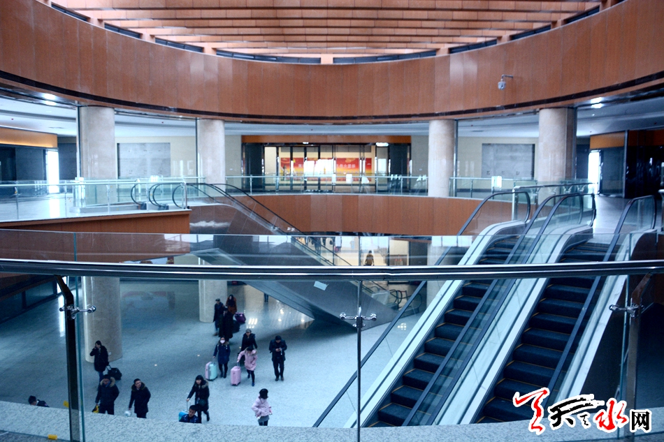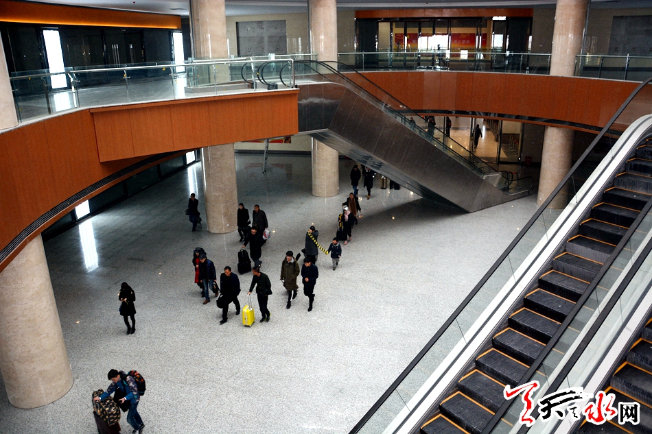 天天天水网讯【记者蔚军平】1月16日,乘坐高铁回到天水的旅客,从天水南站综合交通枢纽一层的换乘服务大厅通过。2017年,天水南站综合交通枢纽及站前广场项目累计完成投资4.1亿元,目前,施工人员正在加快施工进度,力争换乘服务大厅和站前广场在春运前投入使用。