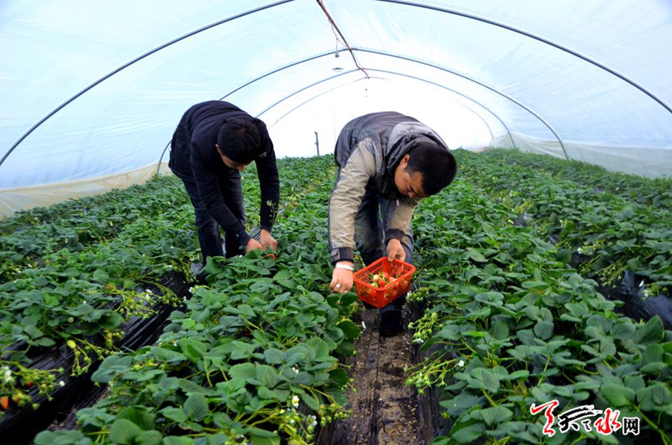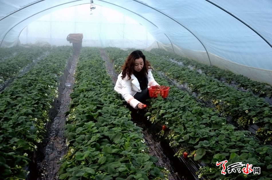 1月22日,记者在秦州区平南镇王坡窑村看到,一排排大棚里种植的草莓在温室里拔节疯长,红艳艳的果实簇拥在青绿的藤蔓和白色的小花之间,散发出诱人的清香,令人垂涎欲滴。
