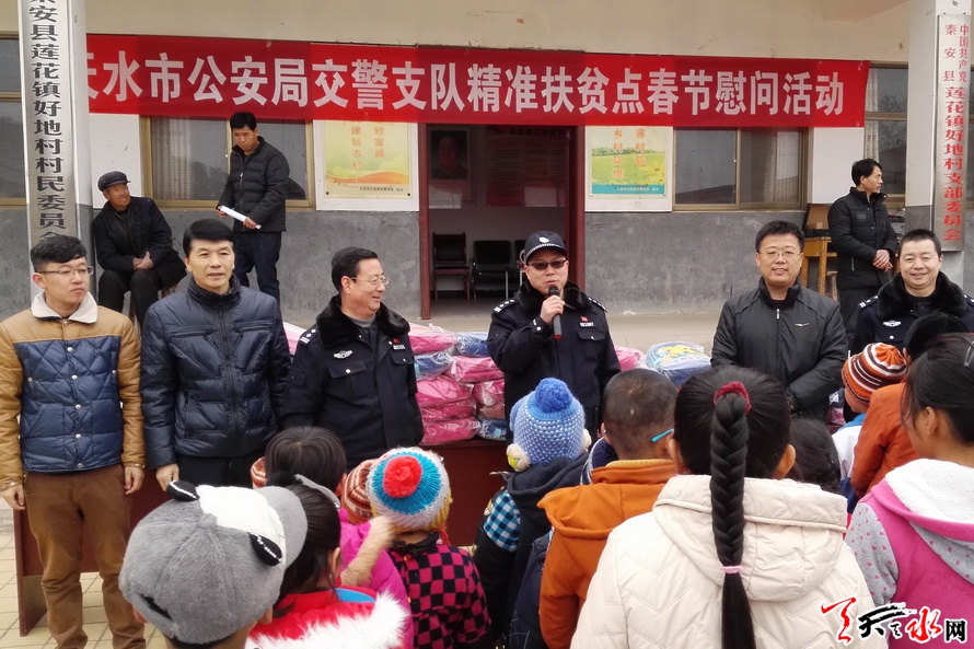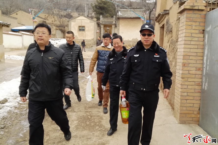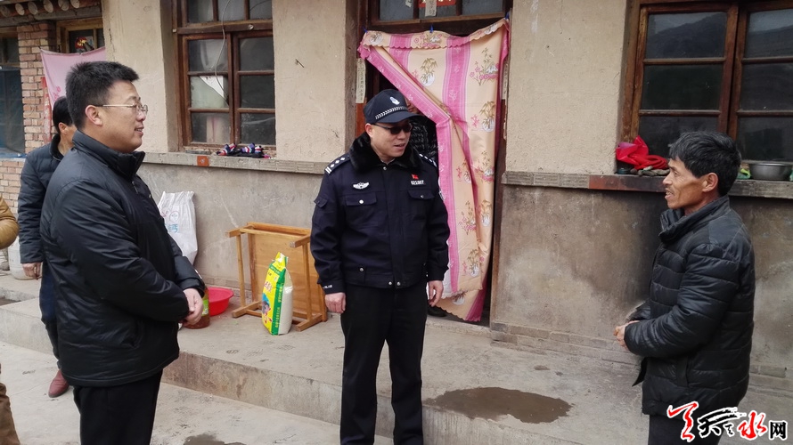 天天天水网讯 1月23日,天水市公安局交警支队副支队长李静宏带领支队机关相关部门帮扶民警会同秦安县莲花镇党委书记、好地村书记以及驻村民警,深入支队精准扶贫帮扶点——秦安县莲花镇好地村,在开展精准扶贫对口帮扶工作的同时,进村入户开展春节前慰问活动。