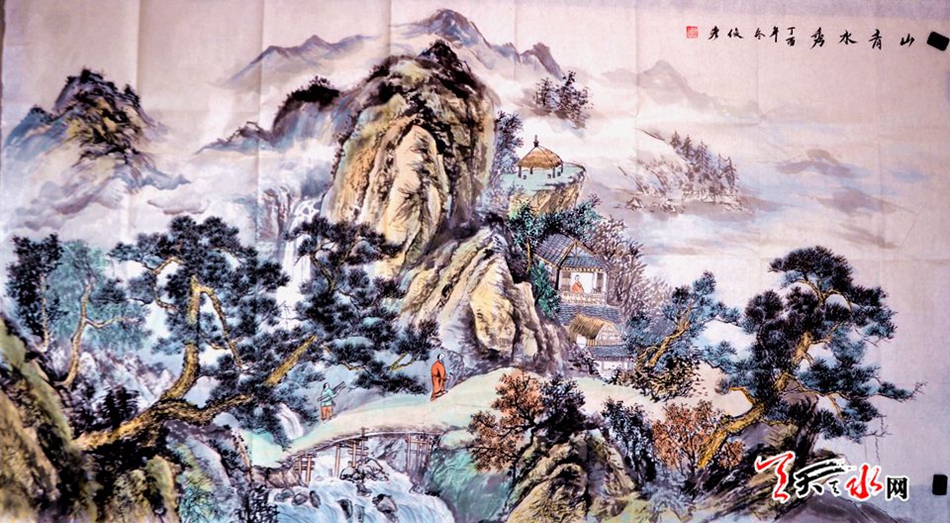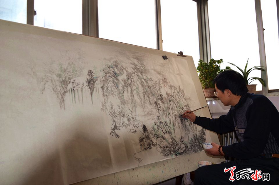 1月23日,古城天水迎来新一轮飞雪,虽然天寒地冻,但住在麦积区的任俊彦家里却是一番春意盎然。他正在挥毫泼墨创作的一幅题为《春意图》的山水画作万物吐绿、春明景和,春回大地的胜景扑面而来。