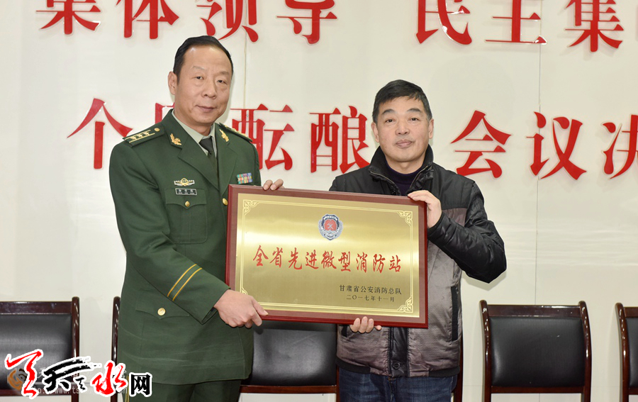 天天天水网讯【记者刘蕾】1月26日,天水市博物馆荣获甘肃省“全省先进微型消防站”授牌仪式在天水市公安消防支队举行,支队长郭学锋代表省公安消防总队向天水市博物馆副馆长高世华授牌,并颁发了奖品,这是全省16个受到表彰单位中唯一获奖的文博单位,也是天水唯一获得此奖的单位。