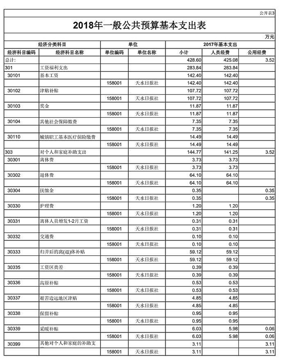2018年天水日报社一般公共预算财政拨款基本支出428.60万元,与2017年425.22万元相比,增加3.38万元,增长0.8%。其中:人员经费425.08万元,与2017年422.59万元相比,增加2.49万元,增长0.6%;公用经费3.52万元,与2017年2.63万元相比,增加0.89万元,增长33.8%。主要原因是:1.在职人员正常晋升工资;2.离退休人员公用经费提标。