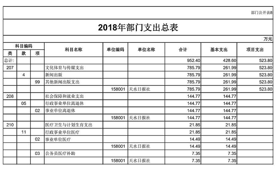 2018年天水日报社预算收入952.40万元,其中:一般公共预算财政拨款收入952.40万元。预算支出952.40万元。
