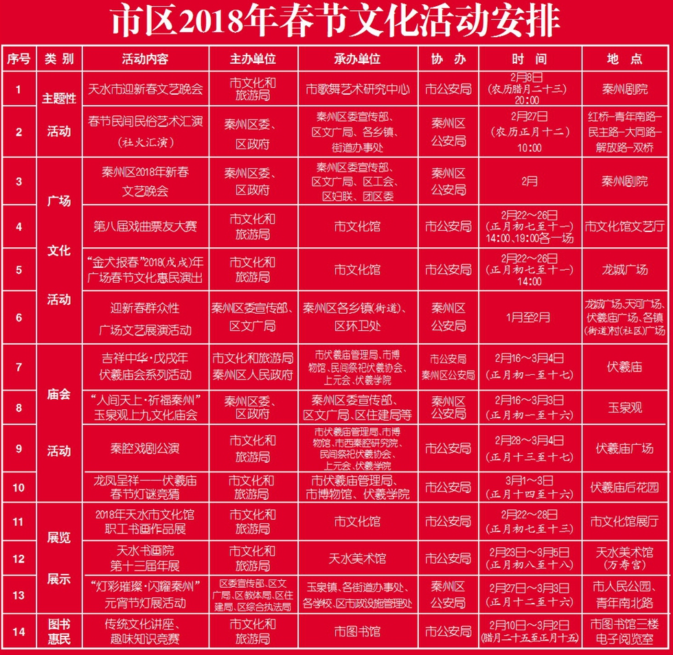 春节期间,秦州区将举办迎新春“邮政杯”广场舞大赛、“坚定文化自信 助力文化扶贫”文艺演出活动、佳水岸小镇新春年货花灯节等6项活动;麦积区将举办“旺狗贺岁”灯谜晚会、近现代名人馆藏书画展、卦台山庙会等7项活动;秦安县将举办“不忘初心”红色经典歌曲大赛、“黄土魂 赤子情”农民书画艺术展、易俗社“秦腔演唱会”、“爱我凤山”万人签名留言等15项活动;甘谷县将举办迎春书画展、秧歌社火表演、彩车巡回表演、健身操汇演等9项活动;武山县将举办春节广场电影周、“书香宁远”读书活动、祈福秧歌展演、“宁远秦韵”戏曲公演等9项活动;清水县将举办数字电影展演、秦腔戏剧展演、庆元宵城乡社火展演等9项活动;张家川县将举办张家川县书画展、农村电影放映、社火表演评比等活动。