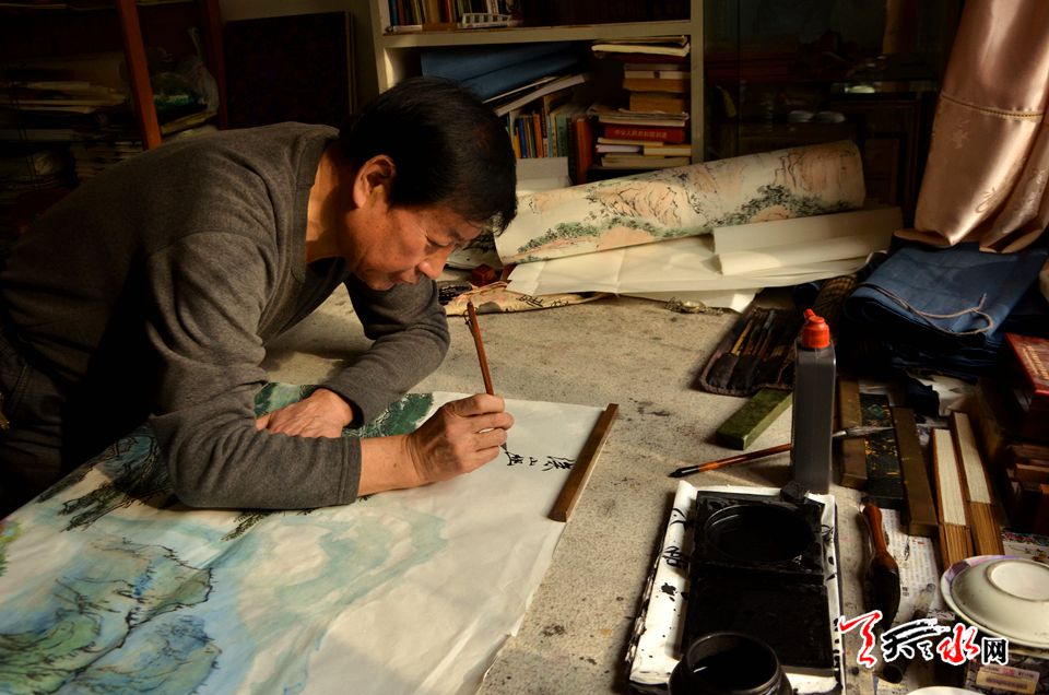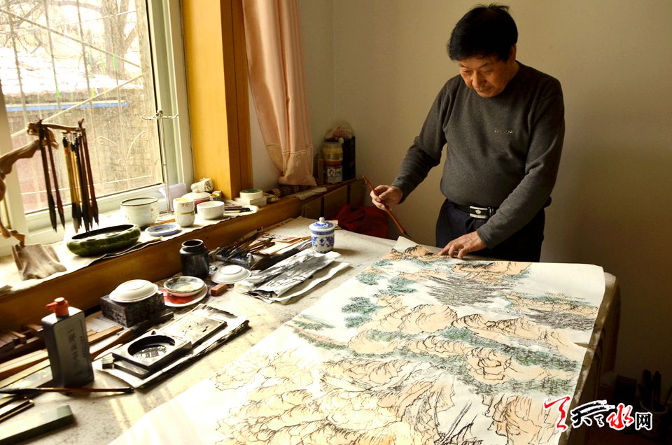 2月3日,临近立春,乍暖还寒,赵应周先生家里却是一番春意融融。一间70多平米的两居室,墙上挂满字画,有争奇斗艳的牡丹画、氤氲空濛的山水画、古朴厚重的行草书法,一股书香门弟的文化气息散发着雅致的墨香。