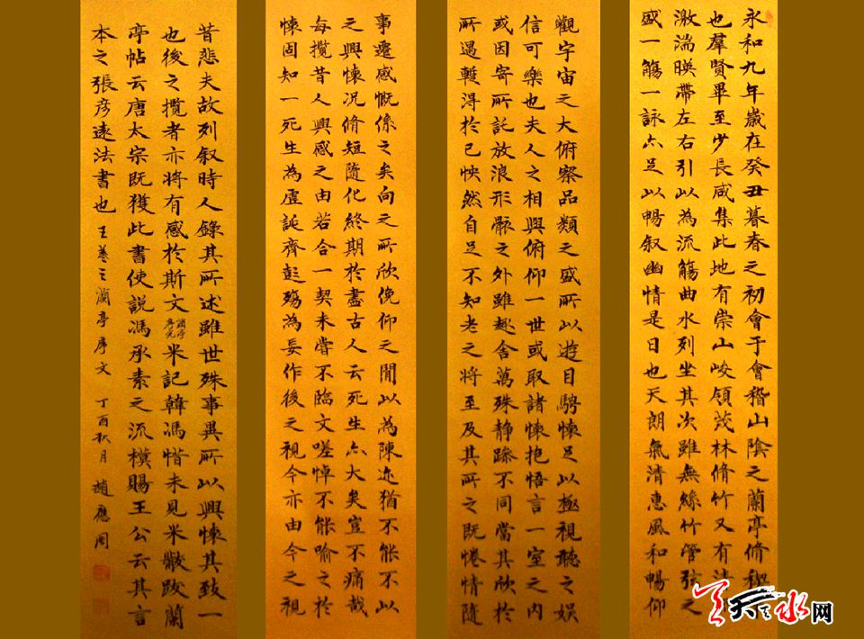 赵应周说,从小受爷爷的熏陶,他从5岁开始研习书法,初学颜真卿,后宗北碑,对金文和北魏六朝碑版悉心临摹,广收博取。几十年的溯源求宗、博采众长,让他的书法艺术精益求精,日臻完善。
