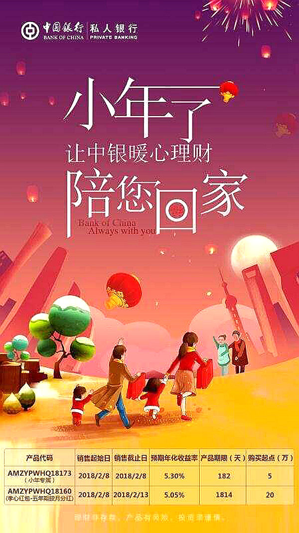 迎新春贺新春,中国银行推出小年专属、新春爆款、情人节专属、春节专属、节气专属、开工利是等系列理财产品,最高收益可达5.3%,欢迎您垂询购买!详情咨询天水各网点:
