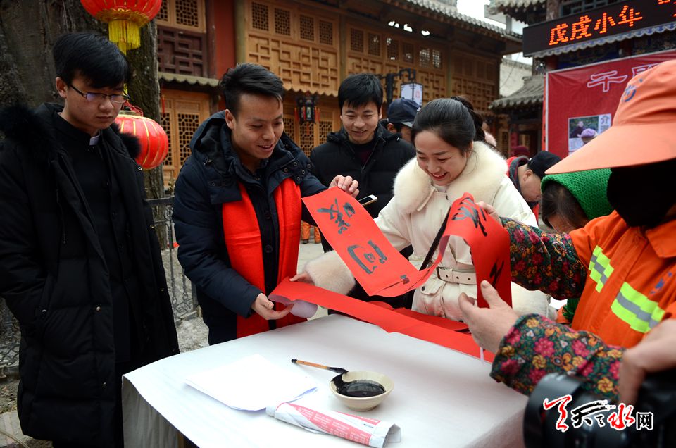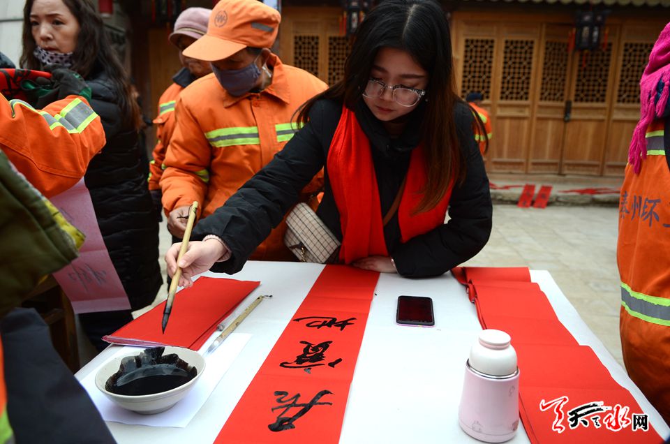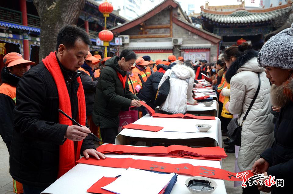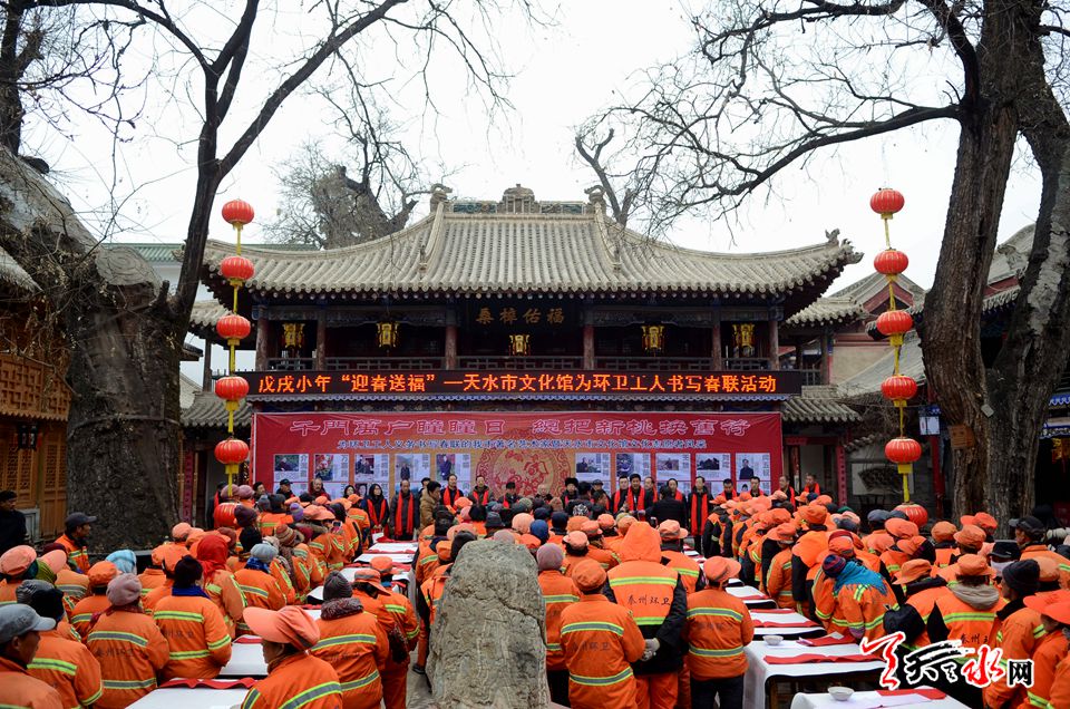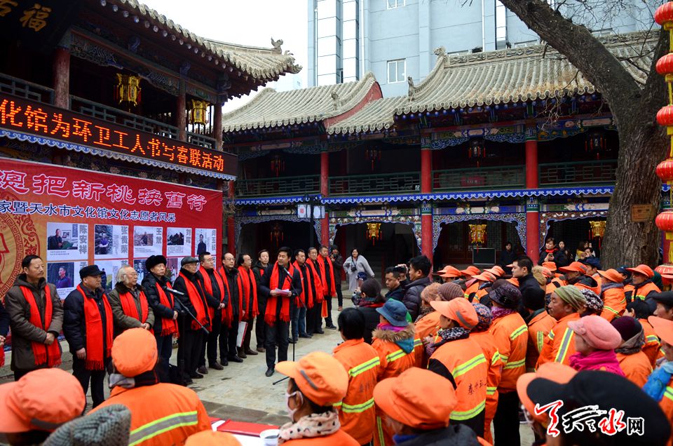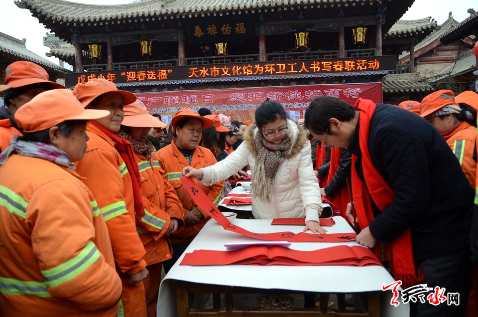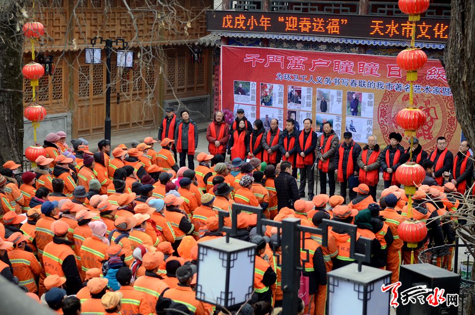 天天天水网讯【记者 张文都 刘晓亚】2月8日,新春佳节来临之际,一场以戊戌小年“迎春送福”――天水市文化馆为环卫工人书写春联活动拉开帷幕。来自天水市20位知名书画家、书法志愿者挥毫泼墨,以送春联的方式慰问环卫工人,为他们送上新春的美好祝福和期盼。