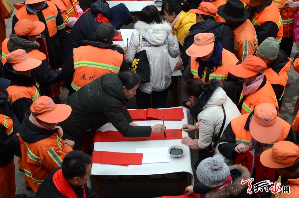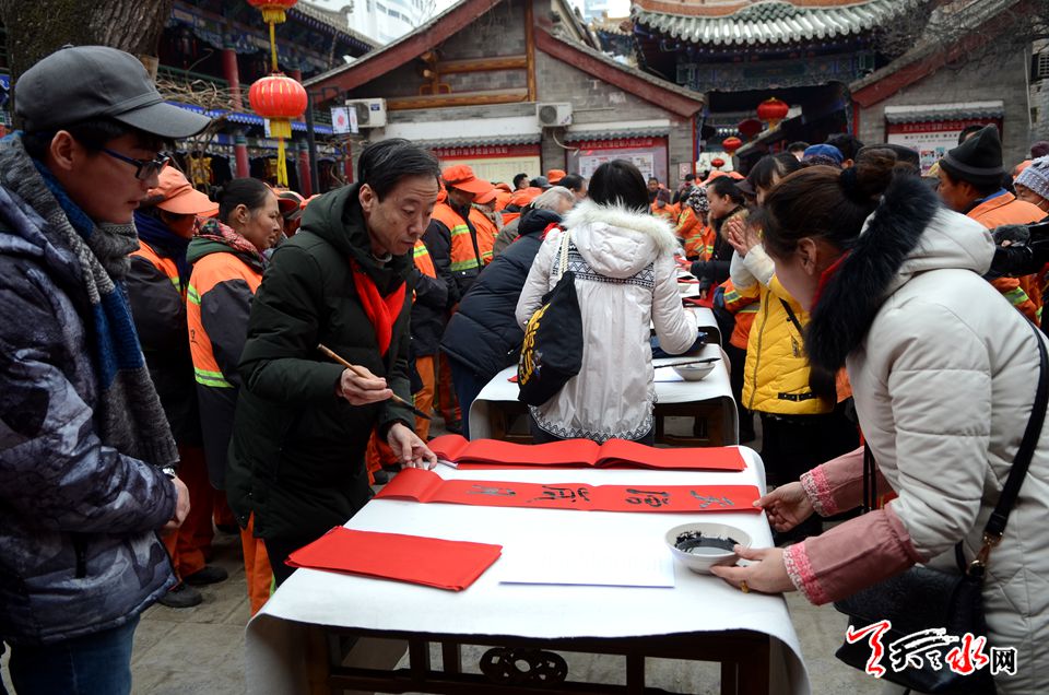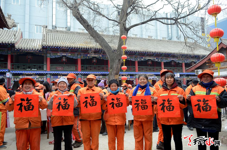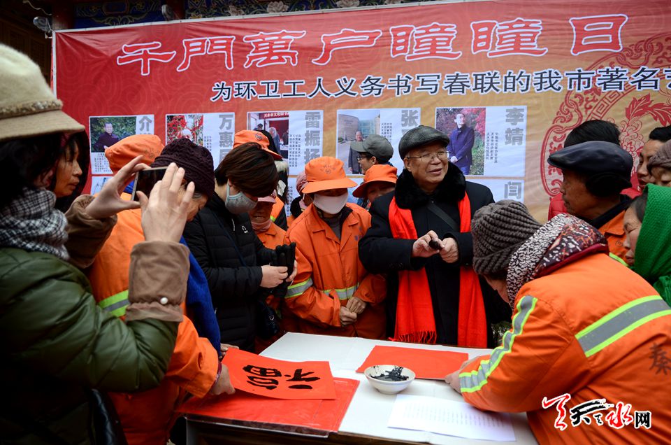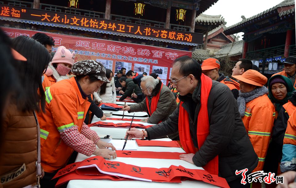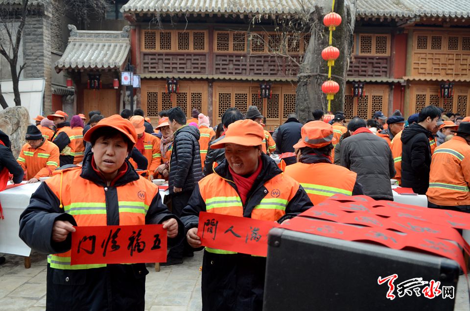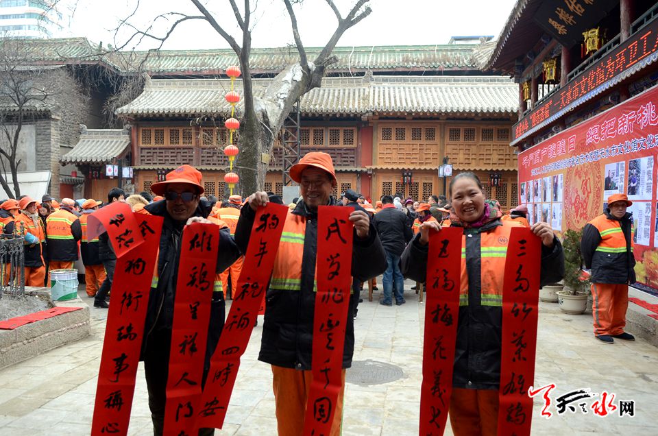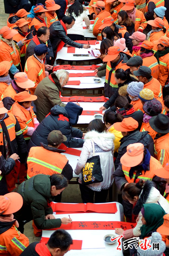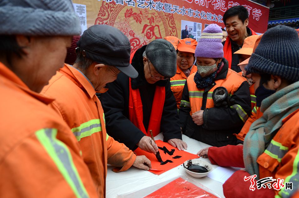 由天水市文化馆、秦州区城乡环境卫生管理局主办的本次活动,邀请天水市的知名书画家介满盈、万惠民、雷振扬、张平、李靖等老中青20位知名书画家,以赠送笔墨的方式把新春的祝愿送到环卫工人的心坎上,让他们感受到新春佳节的暖意。