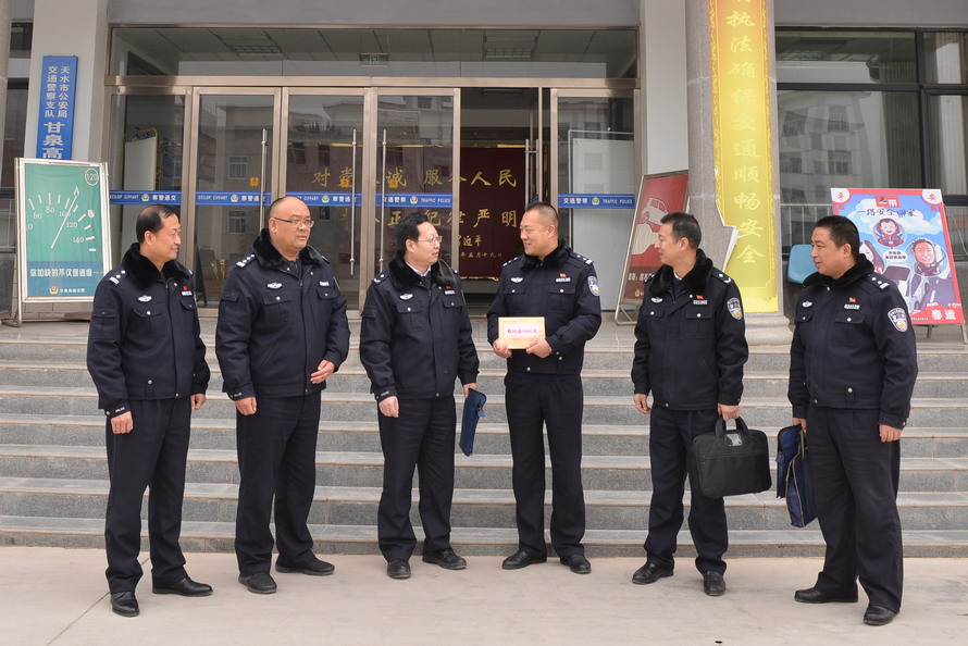 天天天水网讯(通讯员李新社 田泽)2月7日至8日,省公安厅交管局副局长朱来胜带领春运交通安全第七督查组,深入麦积区、甘谷县和G30高速公路宝天段,对天水市春运道路交通安全工作进行了督导检查,并代表厅交管局党委慰问了奋战在交管一线的执勤民警。市公安局党委委员、副局长霍宝珊,市公安局党委委员、交警支队支队长柳润泰,交警支队政委毛建民等陪同检查和慰问。